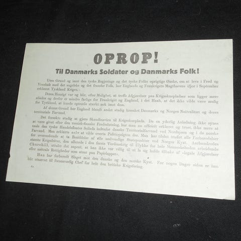 Militær, Oprop flyer, Oprop! flyverblad fra anden verdenskrig, rekvisit, stammer fra Nordisk films gamle rekvisitlager. Tryk på 21x15 cm støv-grønt papir, dobbelt sidet