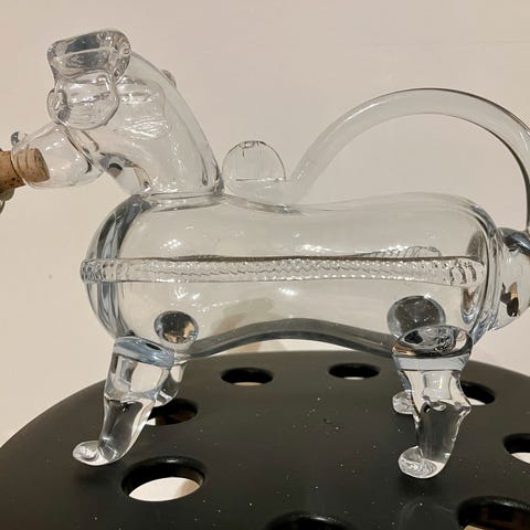 Glas, Snapsehund, Holmegaard, Snapsehund fra Holmegaard. Flot og intakt snapsehund i klart glas med korkprop. Længde 22 cm højde 19 cm.