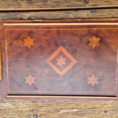 Severingsbakke i træ, håndmalet dansk vintage, Ældre retro vintage bakke i træ med håndtag i fuld bredde og krydsfiner bund.