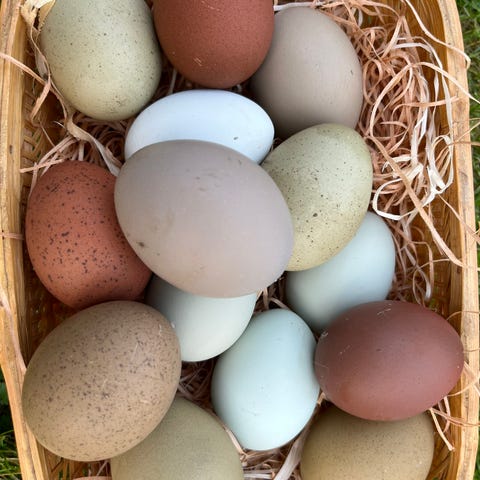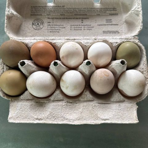 Rugeæg fra min fritgående farverige trup leder efter en ynglehøne eller rugemaskine! Æggene sælges usorteret, så du får æg i alle farver. For alle ægfarver kan høns lægge æg i forskellige nuancer, da det afhænger af, hvilken hane der har befrugtet ægget.