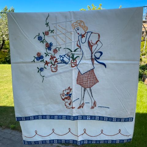Køkkenstykke, af ældre dato, formentlig fra 1940'erne. Hjemmebroderet - RETRO. I pæn stand efter alderen, men repareret foroven i højre side + der er et lille brist højere oppe - SE FOTO.