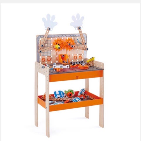 Værktøjsbænk, Værktøjsbænk, Hape, Hape værktøjsbænk med værktøj, diverse skruer og søm sælges. Fra røgfrit hjem.