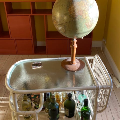 Barbord, bambusflet, Retro bambus bar bord med glasplade og hjul.