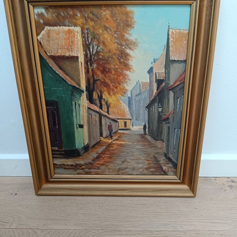 Oliemaleri, Einar Gross, motiv: Gade i Mariager, stil: Naturalistisk, b: 121 (137) h: 78 (94), By motiv af Mariager bymidte. “Det er et kig fra Østergade op mod torvet er min bedste vurdering”