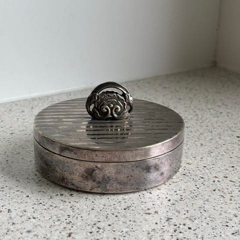 2 - ældre rund smykkeskrin af sølvplet med smukke håndlavede mønstre og fløjlsindsats. Fin stand. H 3 cm, D 9 cm.