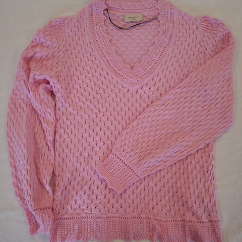 Den lækreste bløde sweater fra Freequent, str. S, Polyester og uld, med trekvart ærmer og i en flot lys grå meleret farve. Jeg har forsøgt at fange den rigtige farve med mit kamera ved at prøve med forskellige baggrunde, men jeg synes den ser lidt mørkere ud end den er i virkeligheden.