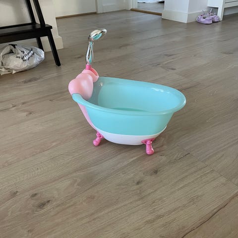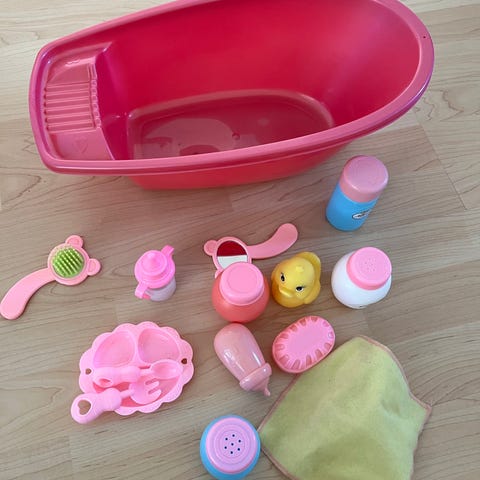 Andet, Badekar, stol og potte, Retro badekar, stol og potte til Nenucodukke (men det kan selvfølgelig også bruges til mange andre dukker). Stolen har to positioner og kan således lægges mere ned. Stolen mangler vist en sele, men den fungerer alligevel.