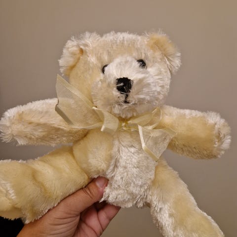 1. Grøn / hvid bamse (12 cm): 15,- kr.