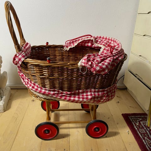 Dukkevogn, Dukkevugge i flet / pileflet, Retro dukkevogn / dukkeseng / dukkevugge med himmel - i naturfarvet kurveflet og træ - fra 50'erne.