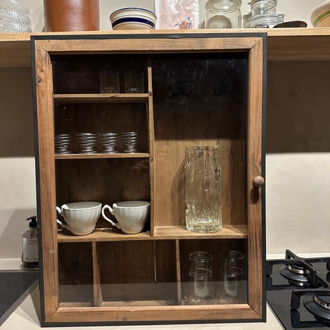 Skabet kan både stå på gulvet, på et bord eller hænge på væggen.