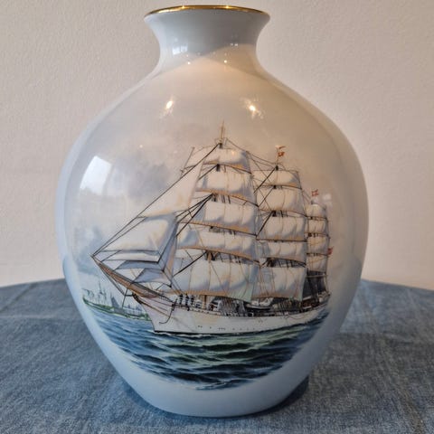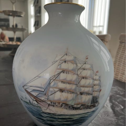 Vase, Vase, Bing & Grøndahl, Skoleskibet ved Kronborg (8872/5506) lavet af James E. Mitchell. Den er lavet i begrænset oplag - den har nr. 496 ud af 2.500 stk ialt. Som ny. Fast pris, bud besvares ikke. Kun afhentning.