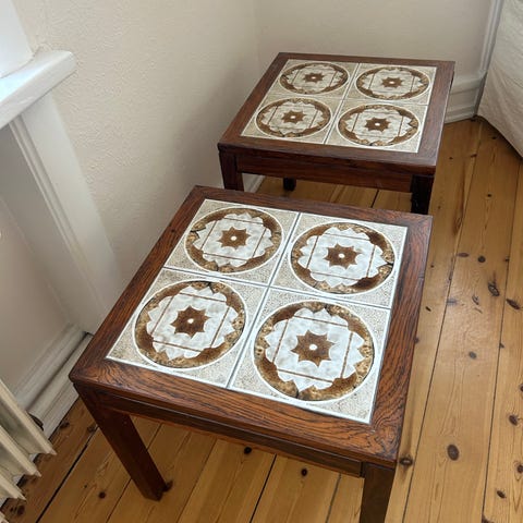 Retroborde med metal og kakler, Okay prøv lige at tjekke de her fantastisk skønne borde. Jeg er altså ret vild med den stil i 70erne og 80’erne, hvor man begyndte at kombinere kakler og metal. Disse lækre borde har sådan en skøn varm farve på overfladen og kan bruges mange steder. De måler H 43 L 64 D 35cm. De kan blive dine samlet for 595kr eller hver for sig 325kr pr stk ??