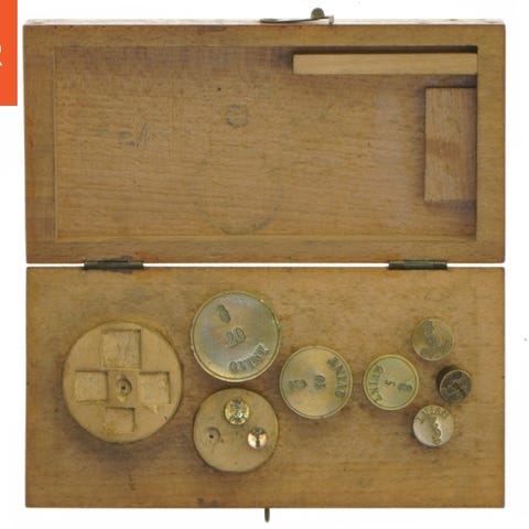 Trækasse med låg, der lukkes med hægte måler 14.5 x 9 x 4 cm og indeholder 8 originale messing lodder med vægtangivelse og samlet vægt på 885,- til 349,-