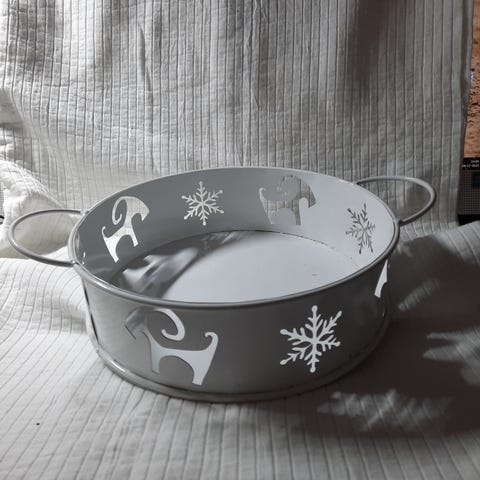 Rund Metalbakke med Blå kant og motiv Af Hvide Gæs i snevejr Kan også bruges som Køkken Væg Pynt Vægpynt i en Bakkeholder eller som Jule pynt Julepynt