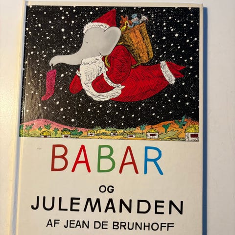 Babar og Julemanden skrevet af Jean de Brunhoff. Oversat af Ida Elisabeth Hammerich. Bogen er udgivet af Thorkild Becks Forlag og trykt hos S.L. Møllers Bogtrykkeri, København. 40 sider med illustrationer i sort/hvid. Udgaven her er fra 1940'erne. Bogens ryg er noget medtaget.