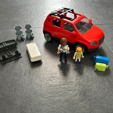Playmobil familiebil med bådtrailer 4144, Perfekt stand. Familiebilen har nogle ridser, ses på ruderne. Familietaskerne er udskiftet, da originalerne ikke kunne findes. Alt andet ser ud til at være der og fungerer perfekt. Dit barn vil helt sikkert elske det.