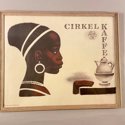 ., Aage Sikker Hansen , motiv: Cirkel kaffe , b: 57 h: 77, Fint billede, HELT NYT, ALDRIG HÆNGT OP.. Ny pris 649 kr. målene er med ramme…obs. der er lidt skrammer nederst i rammen..