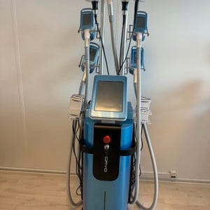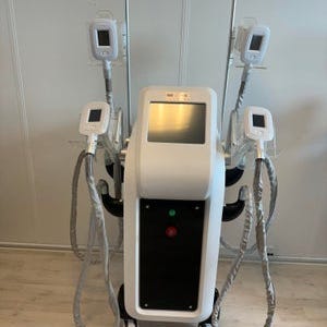 Klinikudstyr, Fedtfrysning , Chione Fatfreezecontour, Højeffektiv professionel cryo bodysculpturing maskine fra Chione Cosmetics. Demo model brugt i vores showroom. Har 5 stk håndtag med 360 graders surround festfrysningsteknologi med både køle- og varmefunktion. Behandlingsområder fra +45 grader og ned til -10 grader giver hurtige og effektive behandlinger med permanente resultater. Præcise og synkroniserede temperatur styring på behandler håndtagene- og maskinens touchskærm, giver sikre og behagelige behandlinger. Behandlingstiderne ligger normalt imellem 20 og 45 min. Afhængigt af behandlingsområdet. Der medfølger 5 stk. behandler håndtag: 1lille, 2 melllem, 1 stort og 1 hagehåndtag. Nyprisen er 180.000,- + moms. Prisen er ekskl. moms.
