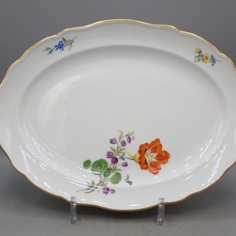 Oval skål Pirke hammer Original Koban Blå rose , Tjekkoslovakiet , nr 25112 fin bøhmisk porcelæn skål med gennembrudt mønster længde 31,5 cm bredde 17,5 cm højde 6,5 cm