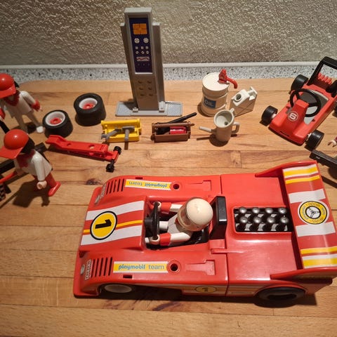 Derfor sælges denne ellers velholdte racerbil med 2 originale mænd samt vejskilte og værktøjskasse med værktøj. Et par røde dunke samt en oliekande. En dunkkraft til bilen.