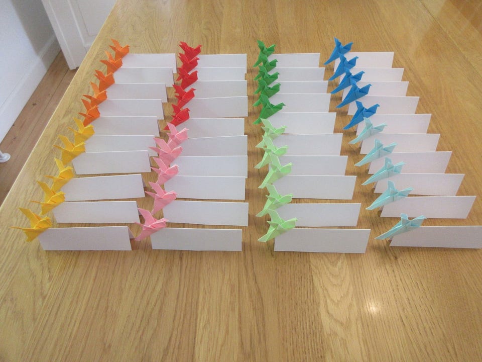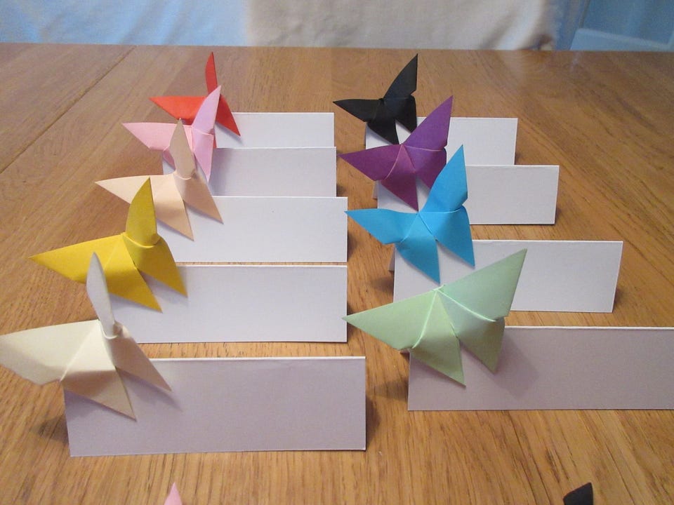 Hjemmeskåret, festlig designet bordkort med hjemmefoldet origami fugl / sommerfugl.