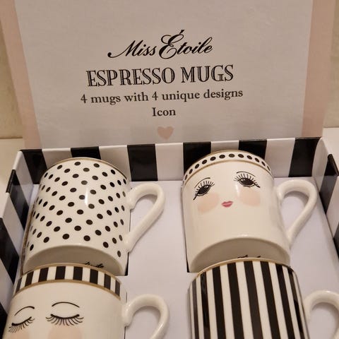 Porcelæn, Kopper, kaffekande, sukkerskål, mælkekande, Miss Étoile, Miss Étoile, Bow and eyes kollektion i porcelæn. Sættet kan tåle opvaskemaskine.
