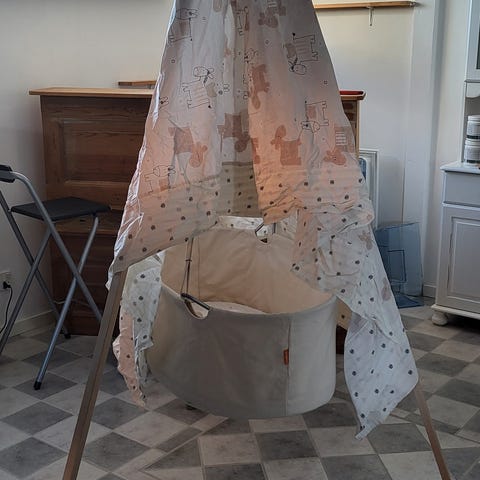 Vugge, Leander vugge, b: 50 l: 80, Super fin vugge der hænger i loftet, som ser hyggelig ud i stuen. Vores søn faldt altid i søvn når vi gav ham en gyngetur. Fremstår pæn selvom den er hvid. Den sælges med ophæng og krog til loftophæng. Der medfølger også stor karabin så den nemt kan tages ned hvis man ønsker at få den pakket væk.