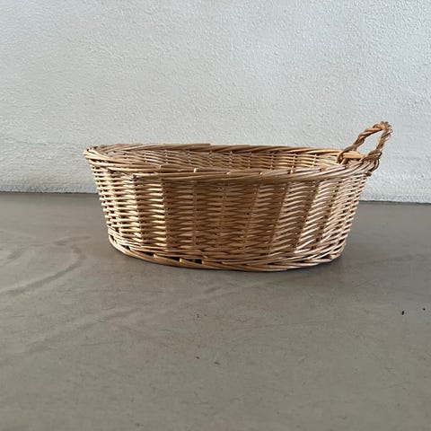 Denne kurv er i flettet bambus. Med bred flet. Hank i hver side.