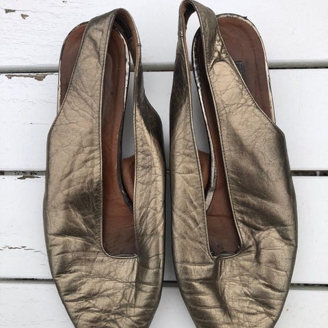 Italiensk damesko i metalliseret sølvfarvet læder med åben struktur. Størrelse 38, 4 cm hæl og justerbar ankelrem med let, guldfarvet spænde. Fremstillet med ægte lædersål.