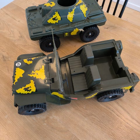 Legetøj, Action man, Original Action Man fra 1970erne. Soldat med 2 uniformer og faldskærmsudstyr. Kun lidt dykkerudstyr da gummidragten desværre er gået til. Diverse maskinpistoler og håndvåben i bælte. Kogegrej og spade...samt en jeep. Det er i ganske god stand dog er moterkaster knækket i ståpladen.