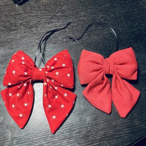 Pyntesløjfer i stof og så er de vatteret så de holder faconen, ca 16 x 18 cm. Pris pr stk. 45,- kr.