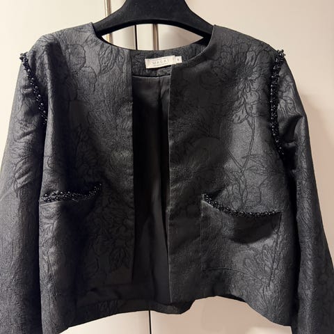 Jakke, str. 44, Masai, Navy/lyse striber, 55%hør/45%bomuld, Ubrugt, Fin kort jakke i diskrete tynde striber. Pyntelommer. Kun brugt en aften længde 64cm,skulderbredde 44 cm