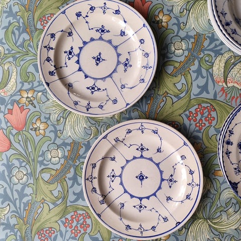 Porcelæn, Musselmalet desserttallerkener, 21 desserttallerkener. 7 stk. af 17,5 cm. af mærket Jæger og 14 stk. mærket med 2 pile se billede. Ca 16 cm.