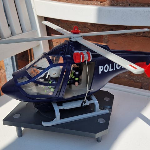 6921 Playmobil Politihelikopter med LED-søgelys er en cool politihelikopter med LED-søgelys, roterende rotorblade, cockpit der kan åbnes og sidespil med reb. To politifolk og tilbehør medfølger. I helikopteren er der plads til tre figurer. Jagten på tyvene kan begynde