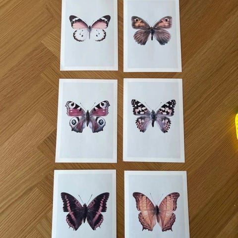 Sommerfuglene kan skubbes ud, og der kan sættes stof eller kulørt papir bag sommerfuglene.