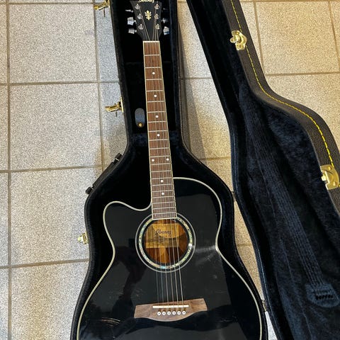 Recording King RG-100 akustisk guitar med dekorativt motiv på kroppen og hovedet. Bruger den ikke og vil ha godt af at blive spillet på.