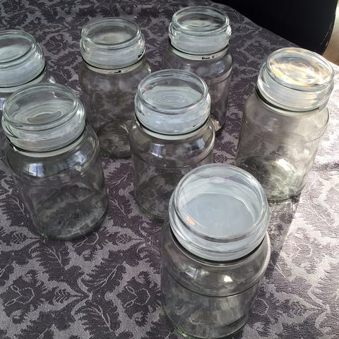 5kr.pr.stk _ Glas, Sylteglas, sylteglas med kobberfarvet metal skruelåg , der hver især kan indeholde knap 3 deciliter _ De er brugt 1 gang til boysenbærmarmelade , så de er så gode som nye _ 9,5cm høje og 7cm i diameter _ vejer hver især 242g.