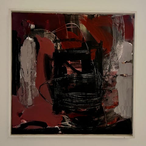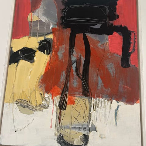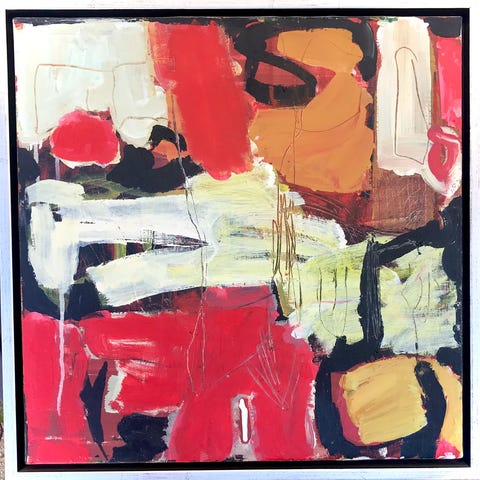 Akrylmaleri, udført i 1998 af billedkunstner Christel Maria Nolle (f. 1951). Abstrakt komposition i svæveramme. Er bag på rammen betitlet "Red One I". Signeret med initialerne "C.N." på lærredet og med "Christel Nolle 98" på rammen. Måler inkl. ramme 58 (B) x 68,5 (H) cm. Har ejet det, siden det blev malet. Er selvfølgelig uden skader.