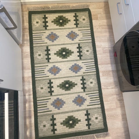 Løse tæpper, Uld, b: 167 l: 260, Pænt og veholdt Rölakan eller kelim gulvtæppe sælges for 1250 kr. Tæppet måler ca. 167 x 260 cm inkl. de flettede frynser.