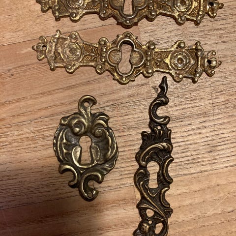 messing, antik beslag, nøglehul, dekoration, møbler, messing, i alt 175kr. nøglehulsbeslag, beslag , messing , 100 år gl., 8 cm. høj , Nøgle hul beslag , Messing , 100 år gl., messing, antik...