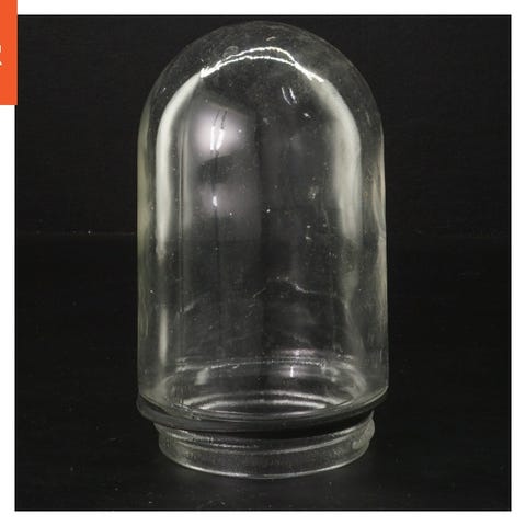 Glaskuppel h 29 cm Ø 12 cm, bund i metal m. Tre runde messing kugleben. Bund Ø 15 cm h 2 cm. Kuppel & bund ialt h 30 cm