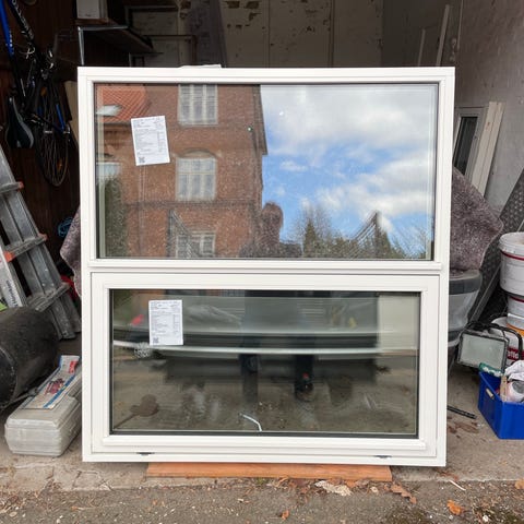 Nyt sidehængt, plast, b: 96 h: 123, 1 stk vindue med 3 lag glas som opfylder de nye krav. Åbner højre indad samt kip og ventilation , der er lister med til at klikke på rammen til indsats og vindueskarm , håndtag.