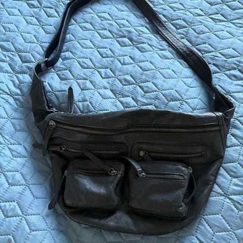 Høj: ca. 16 cm. Bred: Ca. 20 cm. Net til 2 flasker, 3 stk. lynlås lommer samt hank. Blødt skum på bagsiden. Ny aldrig brugt. Pris: 350 kr.