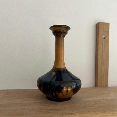 Mål: 15 cm høj, 3.5 cm diameter top, 9 cm diameter bund. Glasuren på vasen er fin og blank, uden fejl.