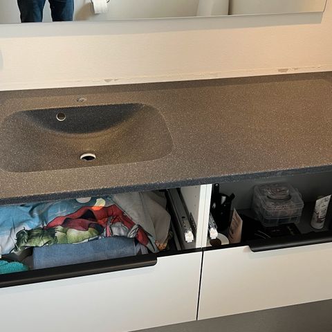 Badeværelsesmiljø, HTH, Flot granit bordplade i sort med under limet vask + blandingsbatteri af mærket Hansgrohe.