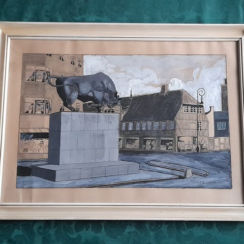 Kultegning, Sejersen, motiv: Pontonbroen mellem Aalborg-Nørresundby, b: 45 h: 34, Kultegning i sort træramme.