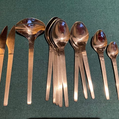 5 gafler, 4 skeer, 1 teske og 5 knive,