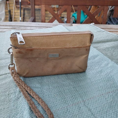 Adax lille lysebrun kosmetik taske med sølv lynlås foroven. Indeni er der et stort rum samt to lommer i hver side. Den ene lomme er med lynlås. Bagpå er der Adax logo med lille sølv mønt. Tasken kan bruges som clutch eller kosmetik taske. Der er ingen stropper på den 🦘