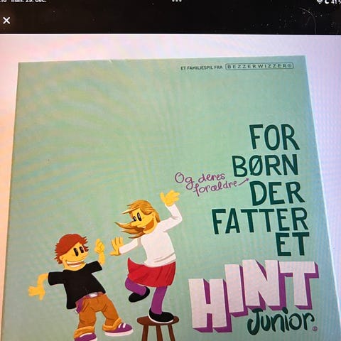 Hint junior er er sjovt familiespil, som med sikkerhed giver masser af hygge og gode grin. Så er der godt nyt til alle børnene der længselsfuldt har set til, mens de voksne har spillet Hint og Rød Hint. Endelig findes der en Hint junior udgave. Spillet inviterer til mange gode timer i hyggeligt selskab, hvor I som familie kan samles om det sjove spil og grine i hinandens selskab, mens I forsøger jer med de sjove kategorier spillet byder på. Hint junior er et underholdende familiespil, hvor dine holdkammerater skal forsøge at gætte, hvad du prøver at hinte til dem. På mange måder minder Hint junior om de klassiske udgaver af Hint, men opgaverne er selvfølgelig børnevenlige, og der skal kun gættes 3 ord på bagsiden af kortet. De to voksenudgaver af Hint spillet består af 4 kategorier, men i den nye børnevenlige udgave, er der tilføjet en ekstra kategori. De 5 kategorier er mime, tegne, tale, lyde og hintmojier. Spillet indeholder 400 kort, som alle har en kortoverskrift på forsiden, og de tre ord, der skal gættes, på bagsiden. Det er nu, det er tid til at imponere dine venner eller familie med dine evner som f.eks. tegner eller mimer. Kan I mime computerspil? Kan I tegne madder fra madpakken? Kan I tale om lande med mange bjerge? Kan I bruge hintmojier til at hinte fabeldyr? Kan I lyde som dyr, der starter med sø? Ligesom på klassisk vis indeholder Hint junior et timeglas, som holder styr på hvor længe, dit hold har til at gennemføre de enkelte opgaver. Det gælder om at være hurtig for sandet løber hurtigt igennem. Og husk, der er et forbudt ord på kortet, som dine holdkammerater ikke må sige. I skal være minimum 4 personer for at spille Hint junior, og børn fra 8 år og opefter kan spille med. Vinderholdet er dem der først får brikken hele vejen rundt på spillepladen. Glæd jer til at finde ud af, hvem i familien der fatter et HINT.