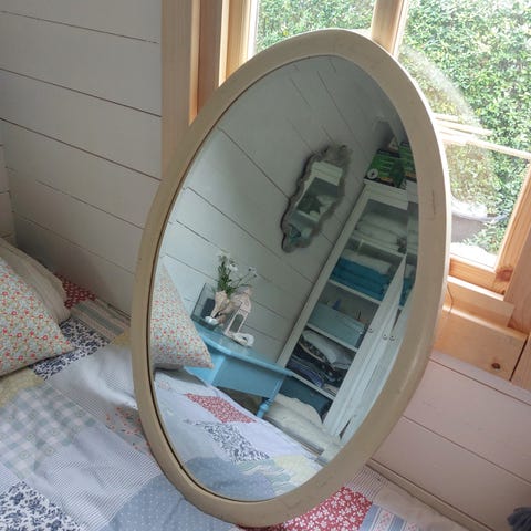Stort facetslebet spejl med hvidmalet ramme, Gammelt hvidmalet og udskåret træramme om facetslebet glas.